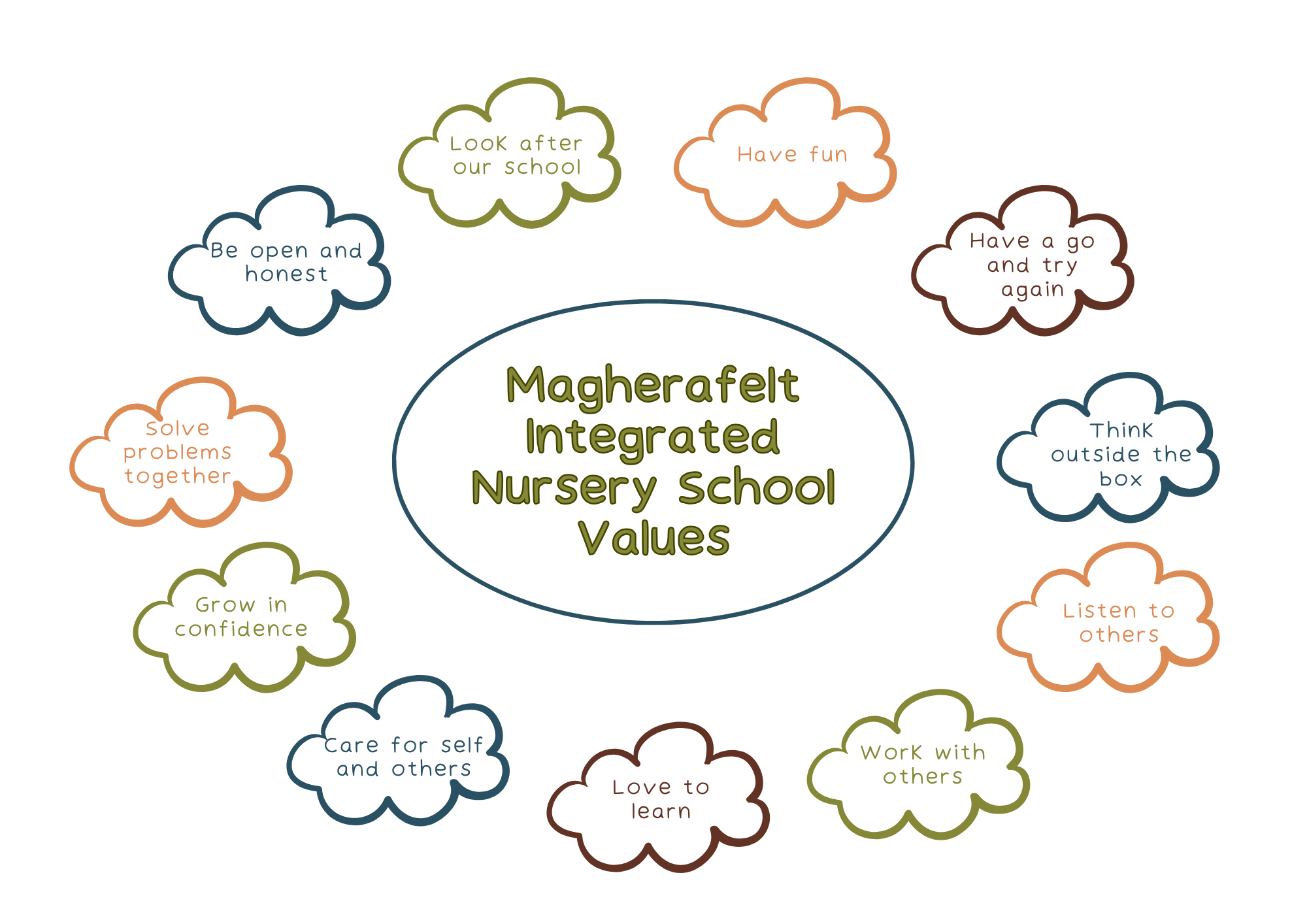 It is our view that “at Magherafelt Integrated Nursery School we provide an ‘informal’ yet highly organised educational environment, which is conducive to both learning and teaching. Staff are pro-active in developing high levels of self-confidence, involvement, and self-regulation; providing our young pupils with a head start in learning that will last a life-time.”