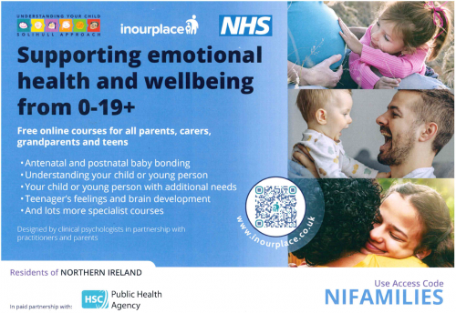 A range of free online courses is available at IN OUR PLACE. Some of the courses state there is a fee but by using the access code 'NIFAMILIES' you can access all the courses for FREE! There are courses for parents, carers, grandparents and teens, and they can be used to help support the emotional health and wellbeing of children of all ages. Some of the courses are available in other languages, if this is relevant to you.
